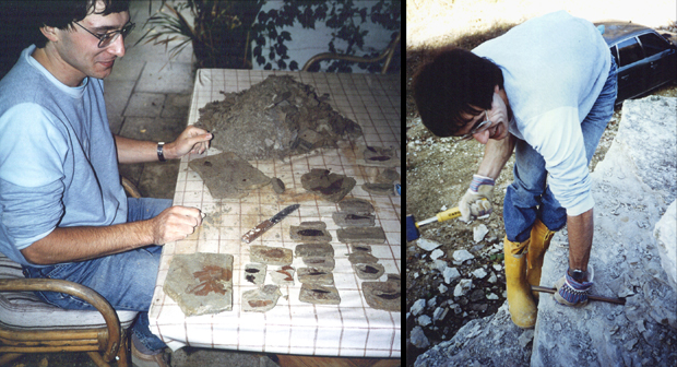 Das Jahr 1984 bedarf besonderer Erwähnung, da es gewichtige Auswirkungen haben sollte. Im Juli 1984 lernte ich nämlich Gabo und Andy kennen. Meine Eltern hatten mir die Teilnahme an der Richter-Reisen Frankenjura-Exkursion geschenkt. Ein folgen-schweres Ereignis --- jeder, der schon einmal auf einer Exkursion mit Gabo und Andy unterwegs war, kann sich vorstellen, wie viele Kisten mit Funden ich nach Hause brachte. Dieses Jahr stellte den Anfang der ernsthaften Platzprobleme zu Hause dar. Es folgten in rascher Folge weitere überaus erfolgreiche Richter-Exkursionen nach Norditalien (April 1985), in die Normandie (Mai 1986) und nach Südfrankreich (April 1987, mit Gipsarm infolge eines Wehrdienstunfalls; Abbildungen 11-12). Kisten über Kisten mit Fossilmaterial, das teilweise noch heute auf seine Präparation und Bestimmung wartet.
